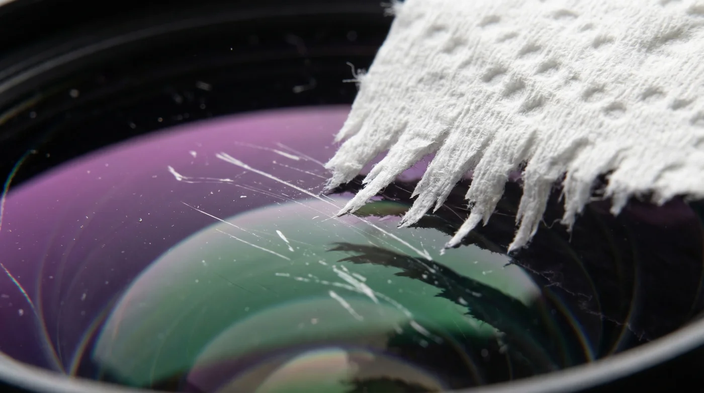Because paper towels are manufactured from coarse cellulose fibers, rubbing them against your lenses creates immense localized friction. The wood fibers act exactly like microscopic sandpaper. While a single wipe might not leave a visible gouge to the naked eye, repeated cleaning creates thousands of micro-scratches. Over time, these microscopic lens gouges strip away the premium anti-glare treatment completely.