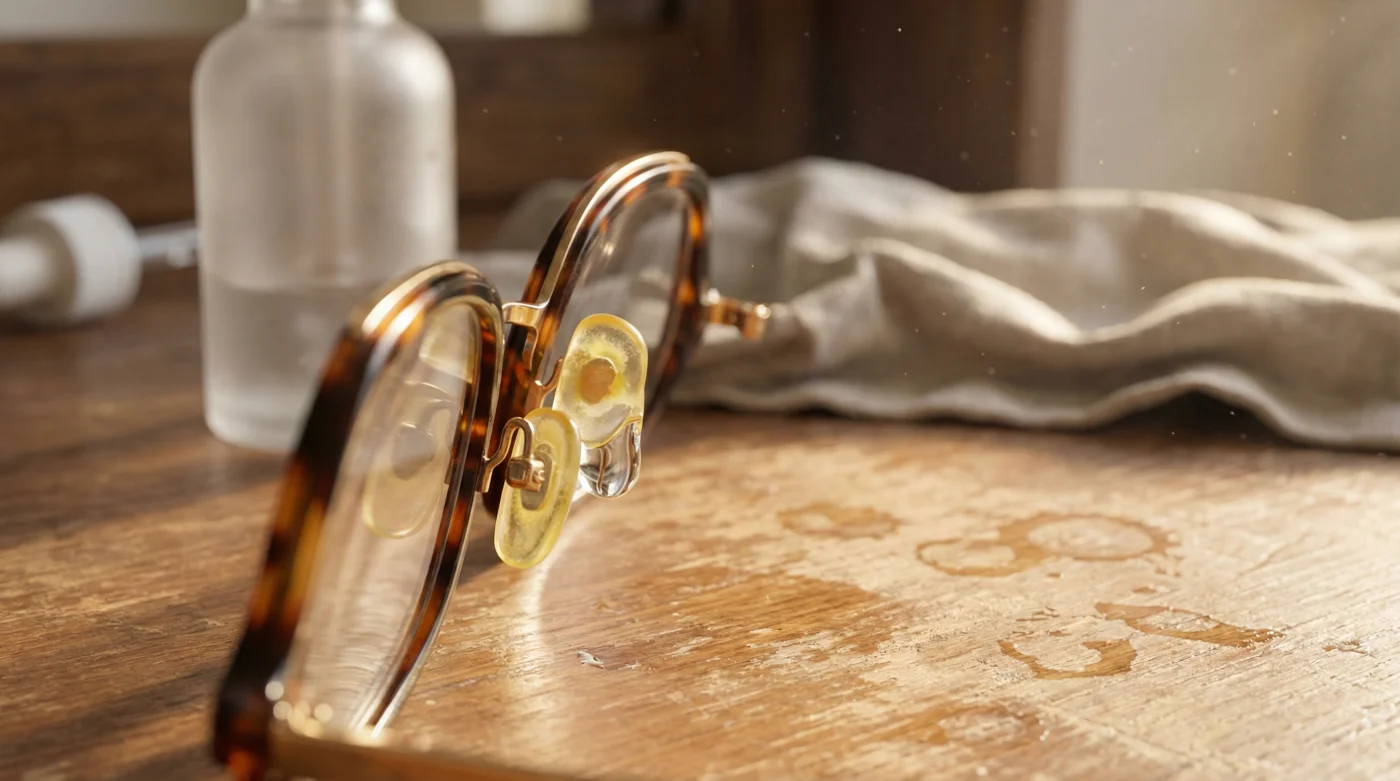 It happens quietly while the morning coffee brews. You stand in the bathroom, feeling the familiar chill of the floorboards, fighting off the dry, biting reality of a Prairie winter. To combat the freezing air, you pat an expensive, viscous serum into your skin. It feels like a small luxury, a moment of hydration before stepping out into minus twenty Celsius. You slip your glasses onto your face, grab your keys, and head out the door. But by the time you reach the bus stop, your frames are already sliding down your nose. A few weeks later, you notice the delicate, clear silicone nose pads on your favourite frames have turned a sickly yellow, taking on a gummy, degraded texture. You likely blame your natural oils, or perhaps the quality of the glasses. You would be wrong.